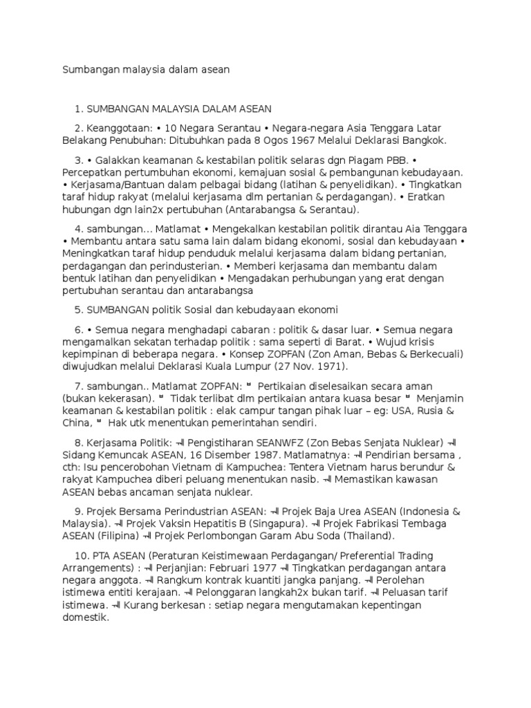 Sumbangan malaysia dalam asean HerRmah SYoyozz. ASEAN merupakan asas bagi dasar luar negara Malaysia. Isi a Peranan dan sumbangan Malaysia dalam ASEAN Malaysia merupakan negara terawal menyedari kerjasama serantau demi keselamatan negara-negara serantau di Asia Tenggara.